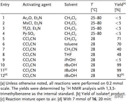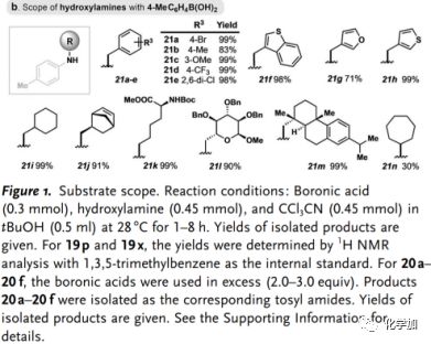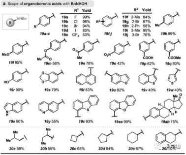 基于以上推測(cè),作者以苯硼酸16和N-芐基羥胺17為模型底物探究反應(yīng)的可行性(Table 1)。作者將16和17溶于CH2Cl2后,考察了活化17中氧原子的各種條件,結(jié)果發(fā)現(xiàn)以CCl3CN為活化試劑時(shí),無(wú)需添加其他堿就能在室溫下以71%的收率得到目標(biāo)的N-芐基苯胺(entry 5)。隨后進(jìn)一步的反應(yīng)條件篩選發(fā)現(xiàn)tBuOH是最佳溶劑,能以幾乎定量的收率得到產(chǎn)物18(entries 6–10)。與此形成鮮明對(duì)比的是,使用其他醇溶劑,如iPrOH(entry 9),并沒(méi)有目標(biāo)產(chǎn)物生成,這表明溶劑對(duì)反應(yīng)結(jié)果有著顯著影響。重要的是,作者發(fā)現(xiàn)該反應(yīng)可以敞口進(jìn)行。最后,該反應(yīng)在7 mmol規(guī)模下進(jìn)行,反應(yīng)20分鐘后生成1.18 g 化合物18,收率92%(entry 12)。