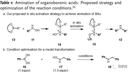 紐大文教授課題組猜想N-烷基羥胺能否作為有效的胺化試劑以形成N-烷基基團(tuán)(Table 1 13+11形成12經(jīng)過(guò)14/15)。鑒于兩個(gè)原料簡(jiǎn)單易得,如果反應(yīng)順利進(jìn)行,該方法可通過(guò)C-N鍵形成應(yīng)用于復(fù)雜化合物后期的偶聯(lián)。N-烷基羥胺與有機(jī)硼酸衍生物的兼容歸因于游離羥基的離去基團(tuán)能力差。作者推測(cè),通過(guò)在氧原子上原位引入離去基團(tuán)活化N-O鍵,可以促進(jìn)14中硼原子上R1基團(tuán)向氮原子遷移。該原位活化策略將避免不穩(wěn)定中間體的分離,并能快速篩選活化條件,提高探索反應(yīng)的效率。