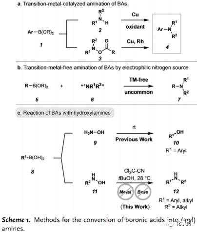 無(wú)金屬參與且在溫和條件下將有機(jī)硼酸衍生物轉(zhuǎn)化為胺的方法具有重要意義(Scheme 1b)。盡管親電氮源與路易斯酸性的有機(jī)硼試劑(如二鹵代硼烷,二烷基硼酸鹽和三烷基硼烷)的無(wú)金屬參與胺化反應(yīng)已有報(bào)道,但有機(jī)硼酸衍生物的胺化反應(yīng)較少,并且通常底物范圍有限或需要苛刻的反應(yīng)條件。此外,反應(yīng)的產(chǎn)物大多為伯苯胺,因此不能用于構(gòu)建復(fù)雜分子,進(jìn)一步限制了其實(shí)用性。
