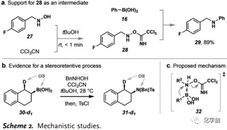 緊接著,作者進(jìn)行各種實(shí)驗(yàn)以深入了解該反應(yīng)的機(jī)制。N-烷基羥胺與三氯乙腈反應(yīng)得到相應(yīng)的鄰-亞氨基羥胺。作者通過(guò)19F NMR光譜監(jiān)測(cè)到27和三氯乙腈在tBuOH中反應(yīng)1分鐘可以幾乎定量的收率形成28(Scheme 2a)。此外,苯基硼酸16與28反應(yīng)可得到預(yù)期產(chǎn)物29,收率為89%。以上結(jié)果表明反應(yīng)的真正胺化劑可能是28。隨后,作者制備了單氘代化合物30-d1并在標(biāo)準(zhǔn)反應(yīng)條件下經(jīng)甲苯磺?;Wo(hù)得到31-d1。其中的氘原子與酰胺基團(tuán)互為順式,這表明30-d1在胺化反應(yīng)過(guò)程中立體構(gòu)型保持不變(Scheme 2b)?;谏鲜鲂畔?,作者推測(cè)胺化反應(yīng)可能是經(jīng)過(guò)渡態(tài)32進(jìn)行,其中R1基團(tuán)從硼原子遷移到氮原子導(dǎo)致三氯亞氨酸酯基團(tuán)的離去。作者推測(cè)32中酰亞胺弛豫到酰胺基團(tuán)有助于降低該過(guò)程的活化能。