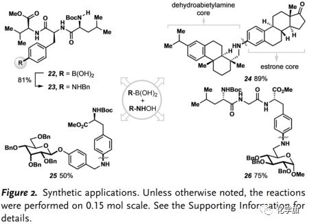 多種官能團(tuán)取代的羥胺同樣能夠參與該反應(yīng)(Figure 1b)。如連有多種取代基的芳環(huán)(21a-21e)以及雜芳基取代的羥胺(21f-21h)都是合適的底物。衍生自賴氨酸(21k),葡萄糖(21l)和天然產(chǎn)物脫氫樅胺(21m)的羥胺均可用作為該反應(yīng)中的有效胺化劑。隨后,為進(jìn)一步證明該方法的實(shí)用性,作者將該方法應(yīng)用于復(fù)雜結(jié)構(gòu)中,均能以優(yōu)異的收率得到仲胺衍生物(Figure 2)。