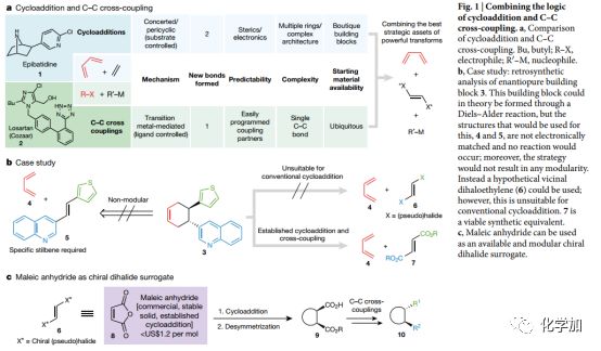Fig.1將環(huán)加成和碳碳鍵偶聯(lián)結(jié)合a.對(duì)比環(huán)加成和偶聯(lián)b.逆合成分析c.馬來(lái)酸酐作為手性二鹵替代品