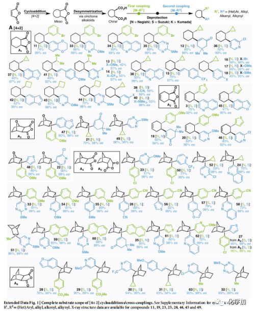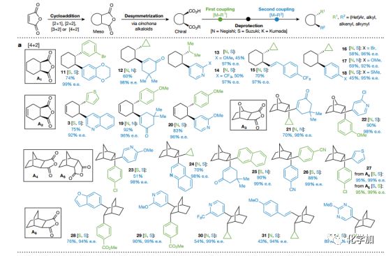 首先從狄爾斯-阿爾德反應(yīng)開(kāi)始(Fig. 2a)。狄爾斯-阿爾德反應(yīng)構(gòu)建的A1-A6在鄧組開(kāi)發(fā)的去不對(duì)稱條件下(以奎寧或奎尼丁為路易斯堿)催化不對(duì)稱醇解,得到高對(duì)應(yīng)選擇性的單酸單酯底物,而后連續(xù)進(jìn)行Negishi和Suzuki類型的RCC反應(yīng)。通過(guò)此過(guò)程,可將簡(jiǎn)單廉價(jià)的狄爾斯-阿爾德反應(yīng)產(chǎn)物A1轉(zhuǎn)化為具有高對(duì)應(yīng)選擇性以及高附加值的產(chǎn)品(11到63,涵蓋了芳香基、雜芳香基、烯烴、具有張力的環(huán)丙基、環(huán)丁基以及簡(jiǎn)單片段甲基和異丙基)。大多情況下狄爾斯-阿爾德反應(yīng)往往需要缺電的烯烴和富電的雙烯,使得反應(yīng)的多樣性大大受限,但文中的方法可以構(gòu)建常規(guī)狄爾斯-阿爾德反應(yīng)不能得到的產(chǎn)物(不論消旋還是手性)。此外,在傳統(tǒng)狄爾斯-阿爾德反應(yīng)中,當(dāng)雙烯片段里有多個(gè)烯烴存在時(shí),無(wú)法有效地控制反應(yīng)。但作者通過(guò)模塊化構(gòu)建解決了此類問(wèn)題(12、15、19、21、25 和31)。有趣的是外型和內(nèi)型異構(gòu)體A4、A5,在調(diào)整反應(yīng)次序后均可得到相同的產(chǎn)物27。