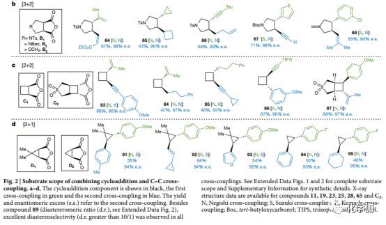此方法可應(yīng)用于多種環(huán)加成反應(yīng)中,如[3+2]、[2+2]和[2+1](Fig. 2b-d),且偶聯(lián)片段與前文所述的狄爾斯-阿爾德反應(yīng)砌塊一樣多種多樣。比如含吡咯烷的體系更可直接應(yīng)用到藥物合成中,大約有四十多種藥物含有此結(jié)構(gòu)。通過(guò)Pd催化可以較為容易地得到的環(huán)戊烯B3結(jié)構(gòu),很難通過(guò)其他方法合成。通過(guò)[2+2]環(huán)加成構(gòu)建的C1 和C2,其對(duì)電子要求嚴(yán)苛,難以滿足產(chǎn)物多樣化的需求,且光催化生成的1,2-二取代環(huán)丁烷結(jié)構(gòu)會(huì)產(chǎn)生難以分離的消旋化物質(zhì)(83-86,源于C1)。有極高的應(yīng)用價(jià)值的四取代手性環(huán)丁烷,多個(gè)二聚和偽二聚環(huán)丁烷天然產(chǎn)物含有此類結(jié)構(gòu),比如87。從D1和D2 骨架開(kāi)始的手性環(huán)丙烷類化合物構(gòu)建也有極高的難度。這些難以通過(guò)傳統(tǒng)手段獲得的多種環(huán)結(jié)構(gòu),均可以通過(guò)文中開(kāi)發(fā)的方法獲得。