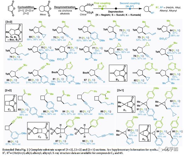 選擇商業(yè)可得的廉價(jià)化合物馬來(lái)酸酐代替帶有手性輔基化合物6參與多種環(huán)加成反應(yīng)([2+1]、[2+2]、[3+2]、[4+2]),然后用手性堿催化去不對(duì)稱醇解,得到具有連續(xù)手性中心的環(huán)加成產(chǎn)物。然后自由基偶聯(lián)、水解、二次自由基偶聯(lián)后便得到目標(biāo)化合物。由于自由基偶聯(lián)反應(yīng)底物的廣泛性,可以實(shí)現(xiàn)多種結(jié)構(gòu)的構(gòu)建,作者在文中展示了包括天然產(chǎn)物以及工業(yè)化生產(chǎn)實(shí)例在內(nèi)的80多個(gè)例子。