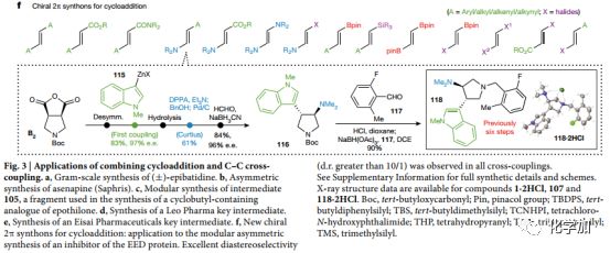 Fig.3 結(jié)合環(huán)加成和碳碳鍵雜交偶聯(lián)反應(yīng)的應(yīng)用a.克級(jí)合成(±)-epibatidine. b.不對(duì)稱合成asenapine (Saphris). c.模塊化合成中間體 105d.合成Leo Pharma的關(guān)鍵中間體 e.合成Eisai Pharmaceuticals的關(guān)鍵中間體f.新手性2π 合成子應(yīng)用于環(huán)加成