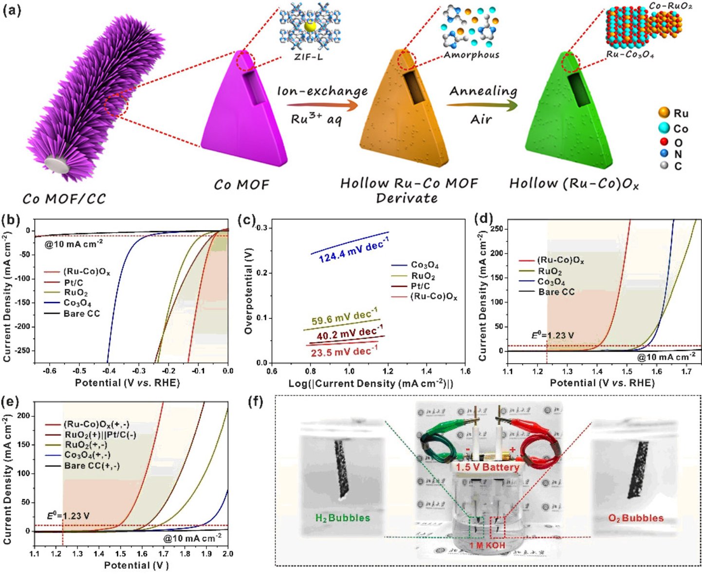 導(dǎo)讀:最近,北京大學(xué)齊利民課題組利用金屬有機(jī)框架(MOF)納米陣列作為模板,通過(guò)原位轉(zhuǎn)化制備得到具有獨(dú)特結(jié)構(gòu)的釕-鈷氧化物((Ru-Co)Ox)中空納米片陣列,并將其作為雙功能催化劑應(yīng)用于高效的堿性全電解水。該研究工作近期在Angew. Chem. Int. Ed.發(fā)表。