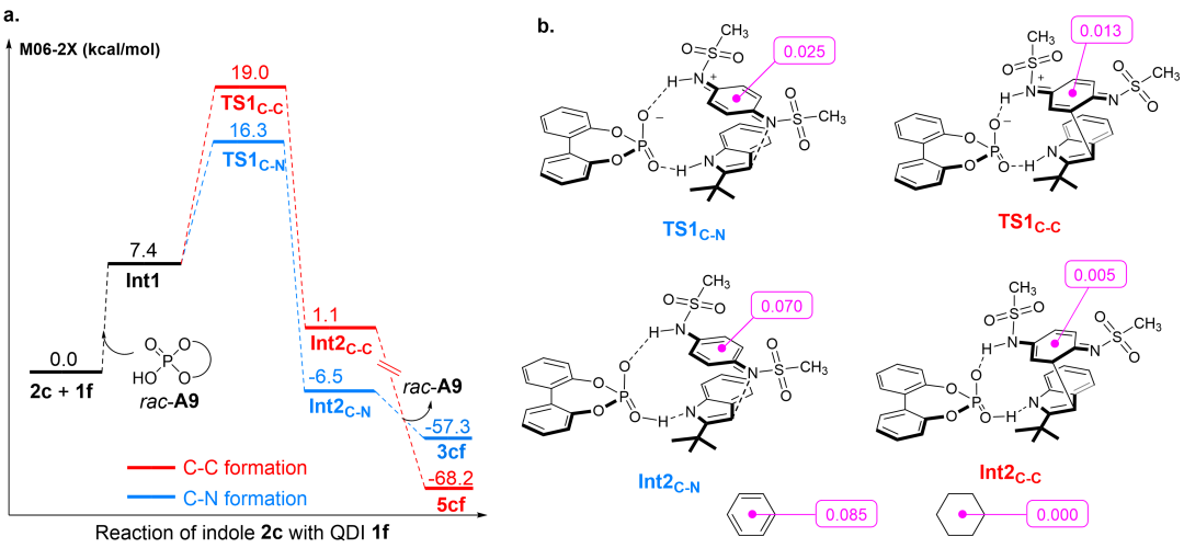廖榮臻教授團(tuán)隊(duì)對(duì)該反應(yīng)的機(jī)理進(jìn)行了理論計(jì)算研究。結(jié)合自由基捕捉、自由基鐘、EPR譜等控制實(shí)驗(yàn),基于密度泛函理論模擬結(jié)果,提出上述1,6-共軛加成是通過(guò)離子型反應(yīng)路徑進(jìn)行。此外,與1,4-加成反應(yīng)的過(guò)渡態(tài)和中間體能壘及其福井指數(shù)和軌道權(quán)重福井指數(shù)對(duì)比,該反應(yīng)高度專一的1.6加成選擇性主要源自于醌二亞胺氮原子顯著的親電性以及過(guò)渡態(tài)和中間體較高的芳香性。