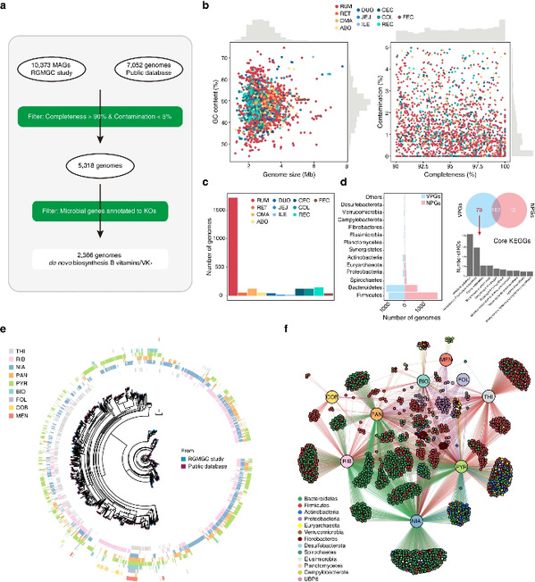 維生素是動物維持正常生理功能而必需的一類小分子化合物。在維生素家族中,B族維生素(VB)主要作為輔酶,參與動物體內碳水化合物代謝,維生素K2(VK2)起著加速凝血和維持凝血的作用。先前研究表明,反芻動物瘤胃微生物可合成VB和VK2,但除瘤胃外的其它胃腸道區(qū)段的微生物能否合成VB和VK2?合成VB和VK2的主要胃腸道微生物種群組成有哪些?日糧結構對胃腸道微生物介導的VB和VK2合成有怎樣的影響?這些問題尚不清楚。在團隊前期構建的反芻動物胃腸道微生物基因集和基因組集的基礎上(《Microbiome》“An integrated gene catalog and over 10,000 metagenome-assembled genomes from the gastrointestinal microbiome of ruminants”,2021),論文收集了已發(fā)表的7,052個反芻動物胃腸道微生物基因組;鑒定出參與VB和VK2合成的1,135,807個微生物基因和167個Kos,發(fā)現(xiàn)其中的2,366個微生物基因組含有能夠從頭合成VB和VK2的基因。論文構建了胃腸道微生物合成VB和VK2的分子路徑,厘清了合成VB和VK2的關鍵胃腸道微生物種群結構,發(fā)現(xiàn)微生物合成的鈷胺素在胃腸道微生物和宿主互作中起著重要介質作用。論文同時揭示了日糧結構變化對奶牛瘤胃中VB和VK2合成的影響規(guī)律,發(fā)現(xiàn)飼喂高精料日糧顯著降低了奶牛瘤胃中鈷胺素合成相關微生物基因的總豐度。研究結果為通過靶向營養(yǎng)調控促進反芻動物胃腸道微生物合成VB和VK2提供了理論依據(jù)。南京農業(yè)大學動物科技學院碩士生蔣遷、博士生林麗梅、謝斐為文章的共同第一作者。毛勝勇教授、劉軍花副教授為共同通訊作者,朱偉云教授、邱強教授(西北工業(yè)大學)、李志鵬教授(吉林農業(yè)大學)、王敏研究員(中國科學院亞熱帶農業(yè)生態(tài)研究所)等參與了該項目研究,該研究得到了國家重點研發(fā)項目的支持。