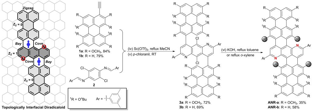 曾澤兵教授課題組基于原子級(jí)精確的濕法合成技術(shù),將兩個(gè)苝分子和1,6-二氮雜蒽片段稠合,使交界處形成新的p-n異質(zhì)結(jié)(Figure 1)。作者在課題組前期發(fā)展的新苝核基礎(chǔ)上,經(jīng)乙炔基修飾、雙重povarov環(huán)化反應(yīng)和高溫堿催化關(guān)環(huán),成功得到了階梯形的氮雜納米石墨烯分子ANG-a~b。以此類(lèi)分子為模型,首次發(fā)現(xiàn)并揭示了納米石墨分子中拓?fù)浣缑鎽B(tài)的自旋極化及其自由基性質(zhì)。