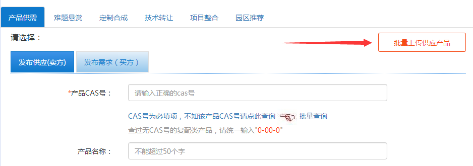 步驟一:在發(fā)布產(chǎn)品供應(yīng)的頁面,右上角有“批量上傳供應(yīng)產(chǎn)品”的按鈕,點(diǎn)擊進(jìn)入,如圖所示。
