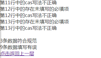 若出現(xiàn)下面這種頁面,顯示有數(shù)據(jù)填寫有誤,且符合規(guī)范的數(shù)據(jù)不與您填寫的CAS號(hào)數(shù)量一致,說明您有部分地方填寫失誤,請(qǐng)重新打開模板文件進(jìn)行檢查修改,修改好重新上傳即可。