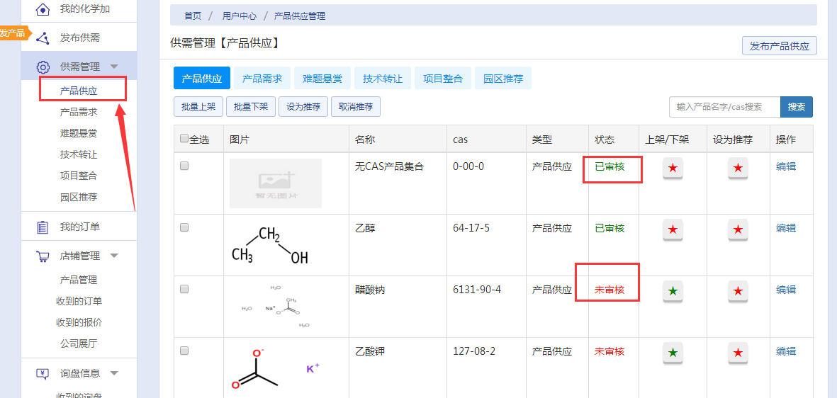 步驟四:批量上傳產(chǎn)品之后,您可以在用戶中心頁面,點(diǎn)擊“供需管理”按鈕,下拉的菜單中點(diǎn)擊“產(chǎn)品供應(yīng)”的按鈕,就可以查看您發(fā)布的產(chǎn)品是否通過了審核,也可以對(duì)其進(jìn)行上架下架,編輯內(nèi)容等操作。