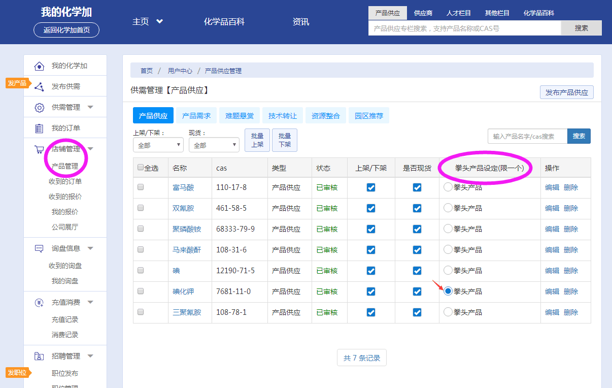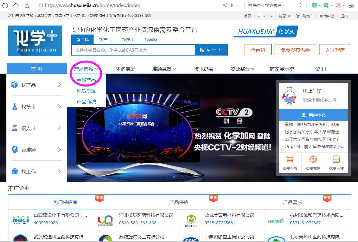 步驟三:設(shè)定好拳頭產(chǎn)品之后,返回化學(xué)加首頁。將鼠標(biāo)移動(dòng)到“產(chǎn)品商城”上,會(huì)顯示下拉菜單,點(diǎn)擊“拳頭產(chǎn)品”進(jìn)入。