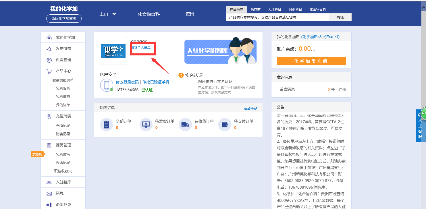 步驟二:注冊(cè)好之后在化學(xué)加網(wǎng)首頁點(diǎn)開“用戶中心”。