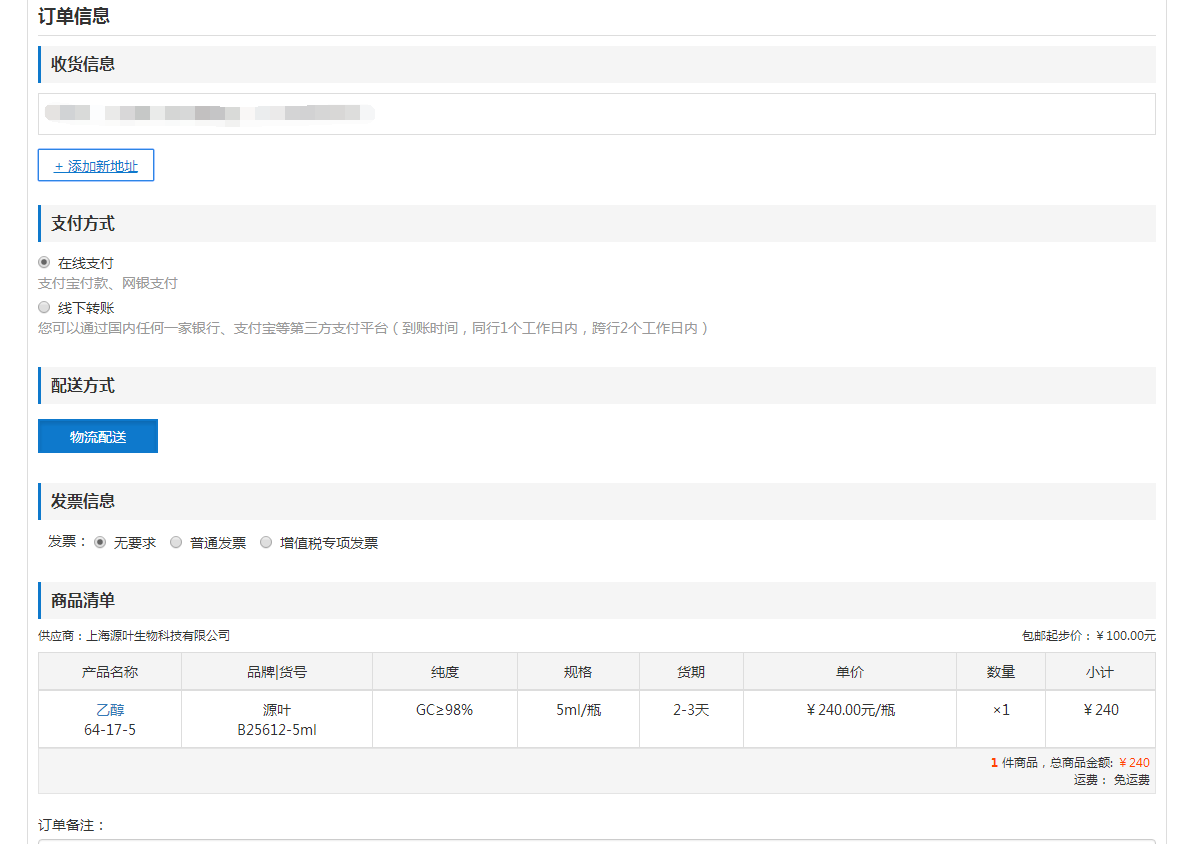 步驟四:填寫好收貨地址,選擇支付方式、發(fā)票信息等,確認(rèn)商品清單,最后點擊確認(rèn)訂單即可。在確認(rèn)了您付款給了化學(xué)加網(wǎng)之后,我們會盡快提醒賣家發(fā)貨,填寫物流信息。等到您收到貨之后,沒有產(chǎn)品質(zhì)量問題等,請再次登錄化學(xué)加網(wǎng)確認(rèn)收貨,我們會將款打給賣家。