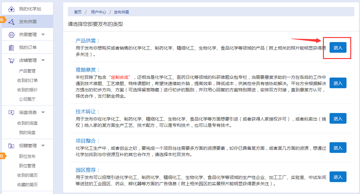 2、可以先進(jìn)入用戶中心,在用戶中心,點(diǎn)擊左側(cè)菜單欄的“發(fā)布供需”。通過以上兩種方式,您都將看到以下頁面,點(diǎn)擊產(chǎn)品供需的“進(jìn)入”按鈕即可。需要發(fā)布其他信息,在此頁面,點(diǎn)擊相應(yīng)的“進(jìn)入”按鈕即可。