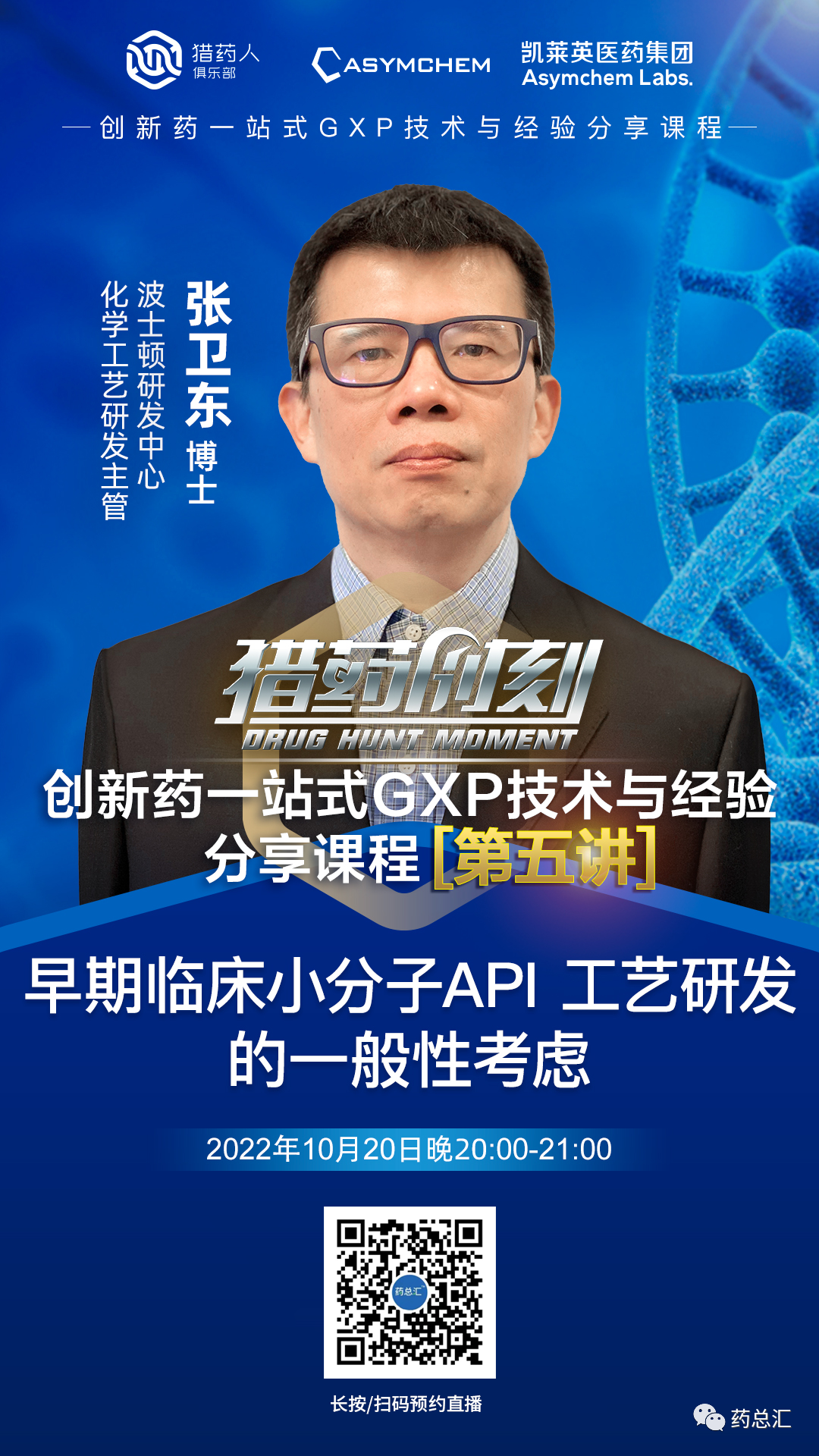 作為《創(chuàng)新藥一站式GXP技術(shù)與經(jīng)驗》分享課程的第五講,獵藥時刻欄目特邀凱萊英醫(yī)藥集團(tuán)波士頓研發(fā)中心化學(xué)工藝研發(fā)主管張衛(wèi)東博士于10月20日晚20:00帶來《早期臨床小分子API 工藝研發(fā)的一般性考慮》...