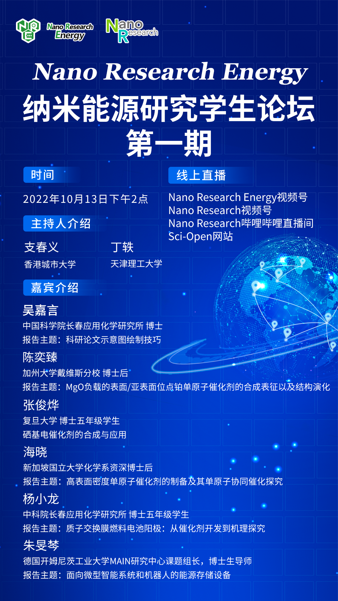 論壇第一期將于2022年10月13日下午2點(diǎn)在線上平臺舉行,首期嘉賓包括發(fā)過Nature的德國青年課題組長朱旻棽研究員、US Davis院士組博士后陳奕臻博士、新加坡國立大學(xué)資深博士后海曉博士、B站知...