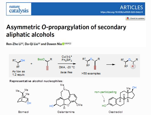 近日,四川大學(xué)化學(xué)工程學(xué)院鈕大文教授團(tuán)隊(duì)在Nature Catalysis上在線發(fā)表了題為“Asymmetric O-propargylation of secondary aliphatic alc...