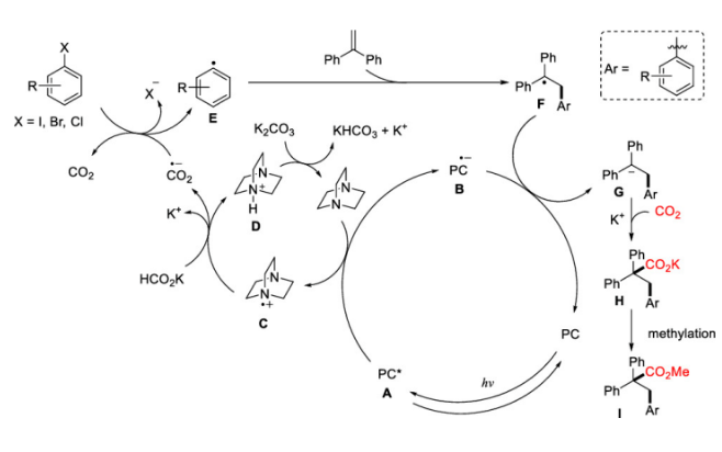 近日,福建物質(zhì)結(jié)構(gòu)研究所李綱課題組報(bào)道了首例具有區(qū)域選擇性,由可見光驅(qū)動(dòng)的,芳基鹵化物與二氧化碳對苯乙烯的還原性羧基芳基雙官能團(tuán)化反應(yīng)。該反應(yīng)不僅適用于廣泛的芳基碘化物和溴化物、吡啶基鹵化物、烷基鹵化...