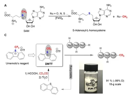 最近,南京大學(xué)化學(xué)化工學(xué)院史壯志、王敏燕團(tuán)隊(duì)首次設(shè)計(jì)合成了仿生d3-甲基化試劑(DMTT),并對其高選擇性d3-甲基化反應(yīng)進(jìn)行了系統(tǒng)的研究。該成果以“Bioinspired Design of a R...