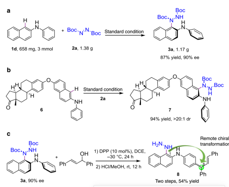 上海交通大學(xué)張書(shū)宇團(tuán)隊(duì)開(kāi)發(fā)了手性磷酸催化N-芳基-2-萘胺與偶氮二羧酸酯的分子間不對(duì)稱(chēng)C-H胺化反應(yīng),能以良好至優(yōu)秀的收率和對(duì)映選擇性得到一系列非二芳基N-C軸手性化合物,其中該報(bào)道使用了π-π相互作...