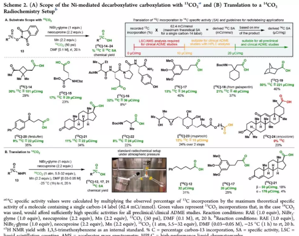 近日,Scripps研究所Phil S. Baran課題組發(fā)明了一種通過直接碳同位素交換的14C放射標記烷基羧酸的方法,即先形成氧化還原活性酯(RAE),然后進行鎳介導(dǎo)的化學(xué)選擇性還原脫羧-羧化(Fi...