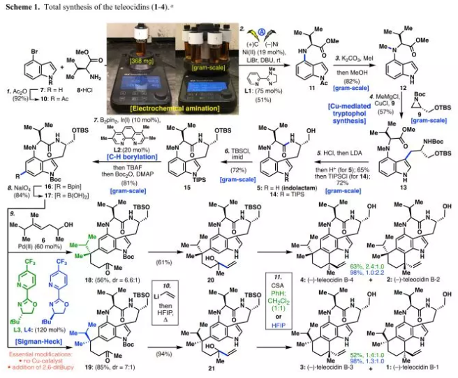 近日,美國Scripps研究所Phil S. Baran課題組通過簡潔的11步反應(yīng)完成了1-4的全合成,其合成策略涉及電化學(xué)芳基胺化、Cu-介導(dǎo)的色氨醇構(gòu)建、C-H硼酸化和通過Sigman-Heck反...