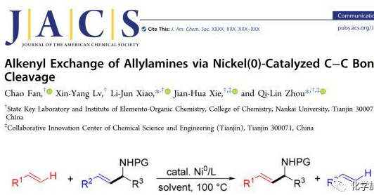 近日,周其林院士團隊報道了通過Ni(0)-催化的C-C鍵裂解實現(xiàn)了烯丙胺和烯烴之間的烯基交換,為制備烯丙胺提供了新途徑。該成果近期發(fā)表在J. Am. Chem. Soc.上(DOI:10.1021/j...