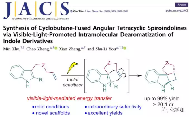 近日,中國科學(xué)院上海有機所游書力團隊開發(fā)了一種可見光促進的吲哚衍生物分子內(nèi)[2+2]環(huán)加成方法,可以極好的收率和立體選擇性得到環(huán)丁烷稠合的四環(huán)吲哚螺環(huán)。該成果近期發(fā)表在J. Am. Chem. Soc...