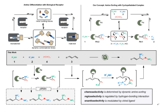 近日,中國科學(xué)技術(shù)大學(xué)黃漢民教授課題組發(fā)展了一種新型的烷基胺動態(tài)排序策略,開拓性地將其長期深耕的氮雜三元環(huán)鈀絡(luò)合物—Huang-Complex作為胺的識別工具,實現(xiàn)了對具有相似結(jié)構(gòu)和性質(zhì)的胺同系物的精...