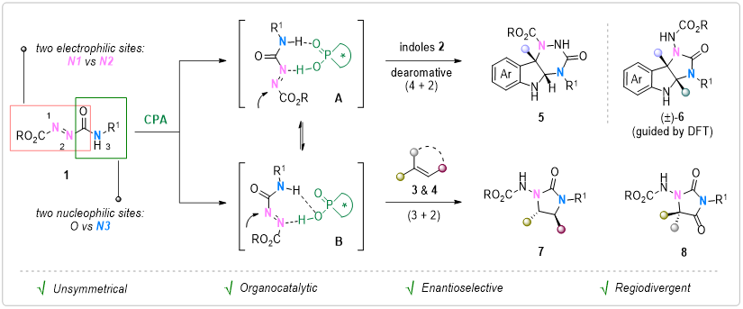 近日,鄭州大學(xué)梅光建課題組報道了新型雙功能胺化試劑偶氮脲(azocarboxamides , ACAs),并利用不同氮源部分反應(yīng)性的區(qū)別實現(xiàn)對多種富電子碳碳雙鍵的有序雙胺化,構(gòu)建出多種手性的非對稱鄰二...