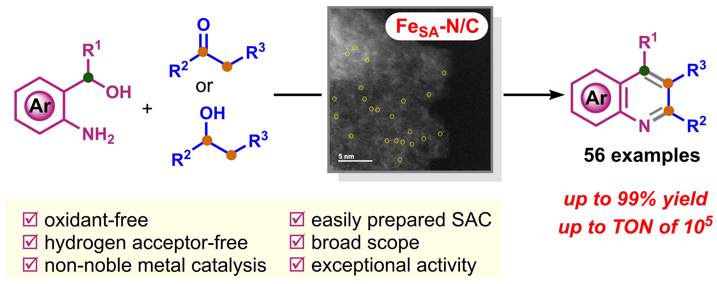 作者開發(fā)了一種具有極高活性的單原子鐵催化無受體脫氫偶聯(lián)反應(yīng)體系用于喹啉類化合物合成。反應(yīng)具有良好的底物普適性,在放大規(guī)模反應(yīng)中展現(xiàn)出很高的催化效率,且在循環(huán)實驗中表現(xiàn)出良好的穩(wěn)定性。...
