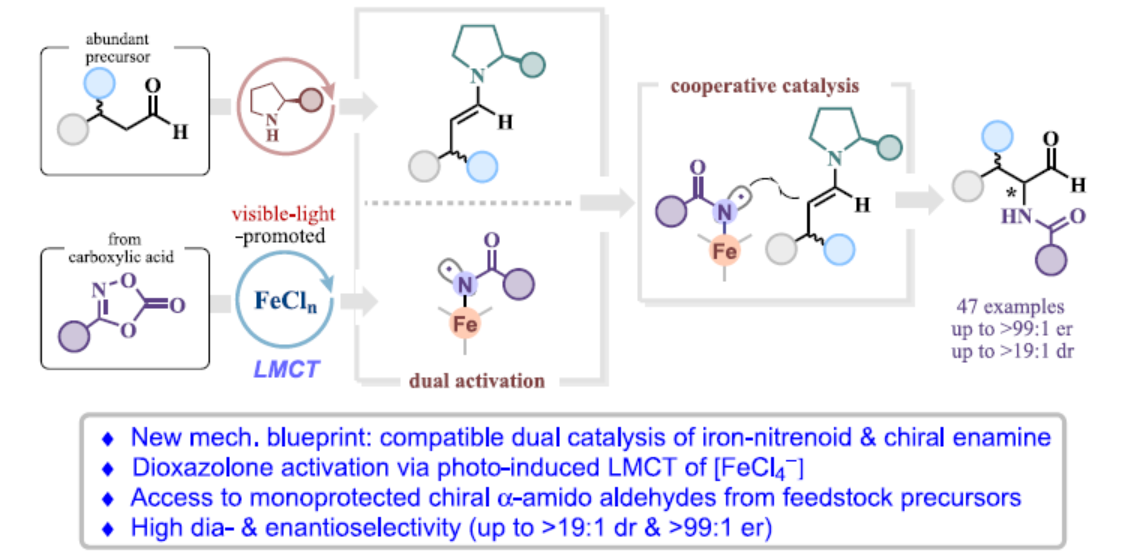 近日,韓國科學(xué)技術(shù)院(KAIST)Sukbok Chang課題組報道了一種通用的鐵與手性烯胺雙重催化醛的對映選擇性α-酰胺化反應(yīng)(amidation)(高達(dá)>99:1 er)?;趯嶒灪陀嬎阊芯浚髡?..