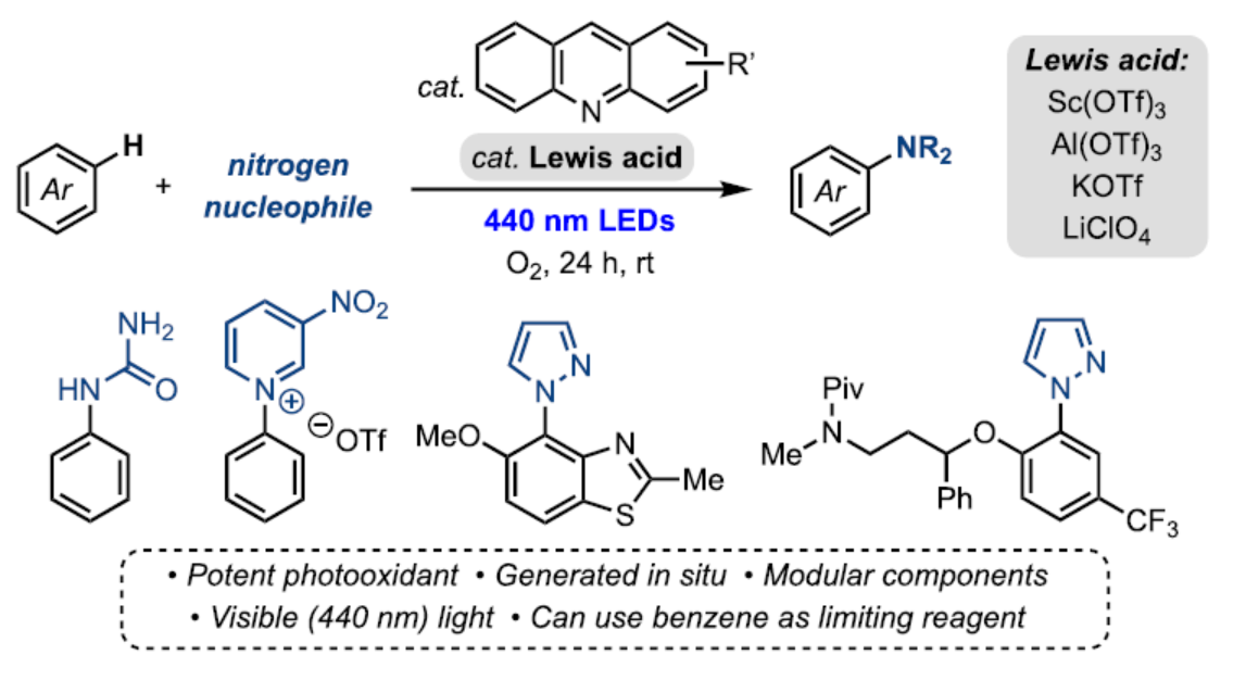 近日,美國(guó)密歇根大學(xué)Melanie S. Sanford課題組報(bào)道了一種可見(jiàn)光光催化C(sp2)?H鍵的胺化反應(yīng)。其中,通過(guò)吖啶衍生物與Lewis酸的組合形成了強(qiáng)大的光氧化劑,在可見(jiàn)光(440 nm)...