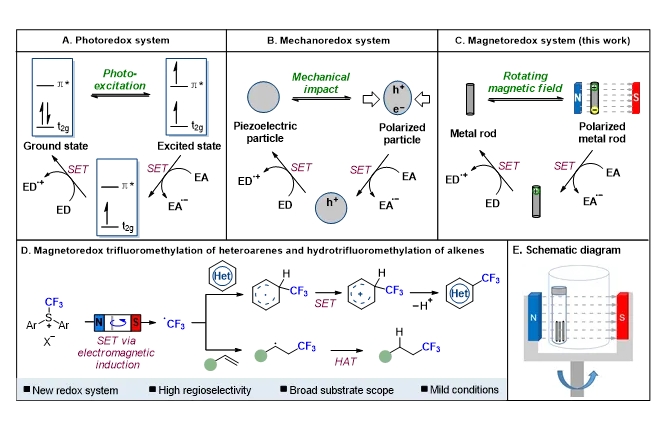 近期,山東理工大學(xué)李新進(jìn)課題組設(shè)計(jì)了一種電磁感應(yīng)促進(jìn)的有機(jī)分子的氧化還原反應(yīng)。該研究的設(shè)計(jì)思路是在旋轉(zhuǎn)磁場(chǎng)中金屬導(dǎo)體通過(guò)切割磁感線產(chǎn)生感應(yīng)電動(dòng)勢(shì),通過(guò)調(diào)控磁場(chǎng)強(qiáng)度、金屬導(dǎo)體長(zhǎng)度以及旋轉(zhuǎn)頻率實(shí)現(xiàn)與反應(yīng)物...