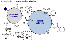 南京大學(xué)謝勁課題組報(bào)道了一種光/鎳協(xié)同催化下羧酸與其衍生物(NHPI酯)間高選擇性自由基-自由基交叉偶聯(lián)反應(yīng)。該反應(yīng)為從市售羧酸合成結(jié)構(gòu)復(fù)雜的酮和含有全碳季碳中心的分子提供了一條實(shí)用的途徑。同時(shí),該策...