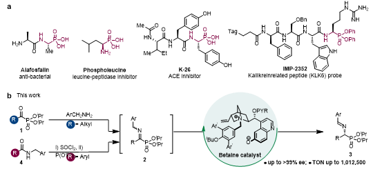 α-氨基膦酸衍生物是一類重要的有機合成砌塊,常見于各類具有抗病毒、抗菌和抗癌等生物活性的重要化合物結(jié)構(gòu)中(圖1a)。亮氨肽酶抑制劑的Phospholeucine,其(S)-對映體的活性比(R)-對映體...