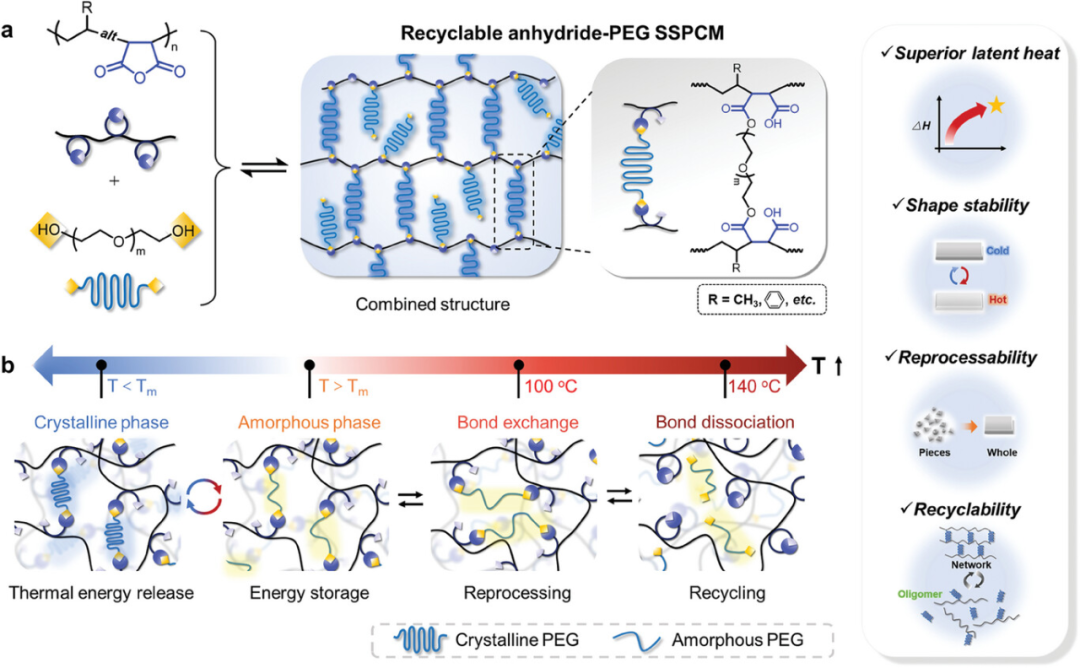 近日,清華大學(xué)楊萬(wàn)泰、仵雅禾團(tuán)隊(duì)利用內(nèi)部催化的可逆酐-醇交聯(lián)反應(yīng)來(lái)制備具有卓越潛熱和非凡雙重可回收性的固態(tài)-固態(tài)相變材料(Solid-solid phase change materials, SSP...