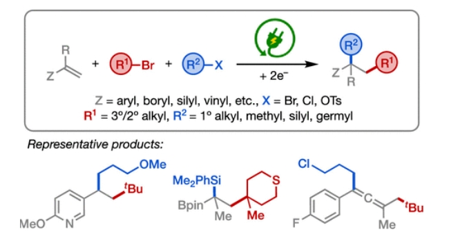 近日,美國(guó)康奈爾大學(xué)(Cornell University)林松課題組開發(fā)了一種電催化烯烴的交叉親電雙烷基化反應(yīng)。該方法具有廣譜的底物適用范圍,并以良好的化學(xué)選擇性和區(qū)域選擇性實(shí)現(xiàn)了一系列雙烷基化產(chǎn)物...