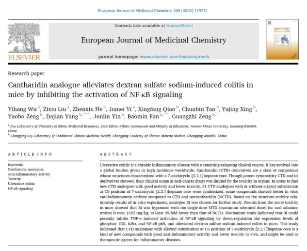 近日,云南民族大學(xué)化學(xué)與環(huán)境學(xué)院樊保敏教授和民族醫(yī)藥學(xué)院曾廣智教授團(tuán)隊(duì)在藥物化學(xué)領(lǐng)域國際知名期刊European Journal of Medicinal Chemistry上發(fā)表題為“Canthar...