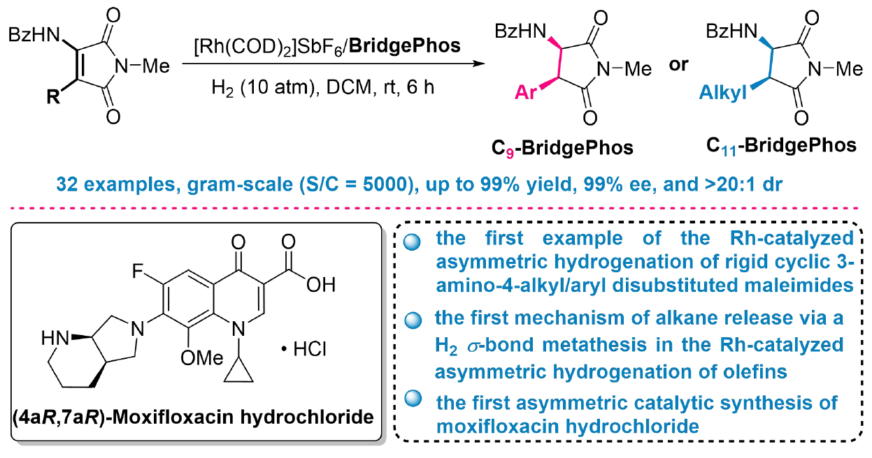 上海交通大學(xué)張萬(wàn)斌課題組利用自主開(kāi)發(fā)的二面角可調(diào)的BridgePhos-Rh催化體系成功實(shí)現(xiàn)了剛性環(huán)狀3-氨基-4-烷基/芳基二取代馬來(lái)酰亞胺的高收率、高立體選擇性不對(duì)稱(chēng)氫化,首次實(shí)現(xiàn)了氟喹諾酮類(lèi)抗生...