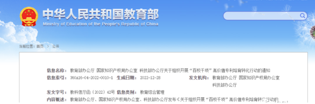 近日,教育部辦公廳 國(guó)家知識(shí)產(chǎn)權(quán)局辦公室 科技部辦公廳關(guān)于組織開(kāi)展“百校千項(xiàng)”高價(jià)值專利培育轉(zhuǎn)化行動(dòng)的通知。...