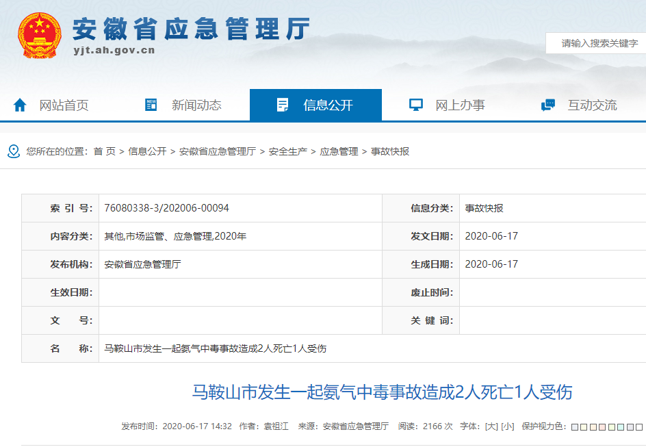 6月17日上午9時,安徽省馬鞍山市馬鋼化工能源科技有限公司硫銨工段在生產(chǎn)過程中發(fā)生氨氣泄露,當(dāng)場造成3人中毒,后送往市人民醫(yī)院搶救。截至當(dāng)前,已造成2人死亡,1人仍在ICU室搶救。...