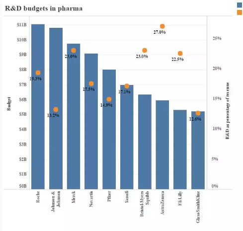 此前安永曾發(fā)布報告指出,2018年全球醫(yī)藥市場規(guī)模約為1.25萬億美元,而這當中研發(fā)投入大型制藥公司依然是主力軍。這一整年中,銷售額最高的15家制藥公司對新藥研發(fā)的投入總計達到了1000億美元。這一高...