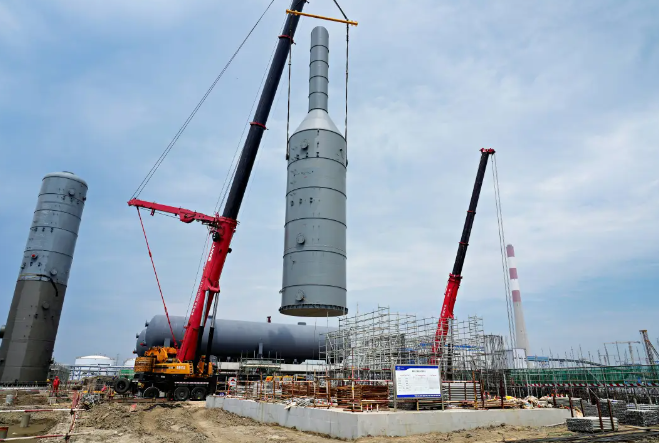 8月13日,在慶陽(yáng)市西峰工業(yè)園區(qū)南部石化產(chǎn)業(yè)園內(nèi),慶陽(yáng)宏大化工20萬(wàn)噸雙氧水項(xiàng)目正在加緊進(jìn)行設(shè)備內(nèi)件、填料的裝填作業(yè),為投料試生產(chǎn)作準(zhǔn)備。...