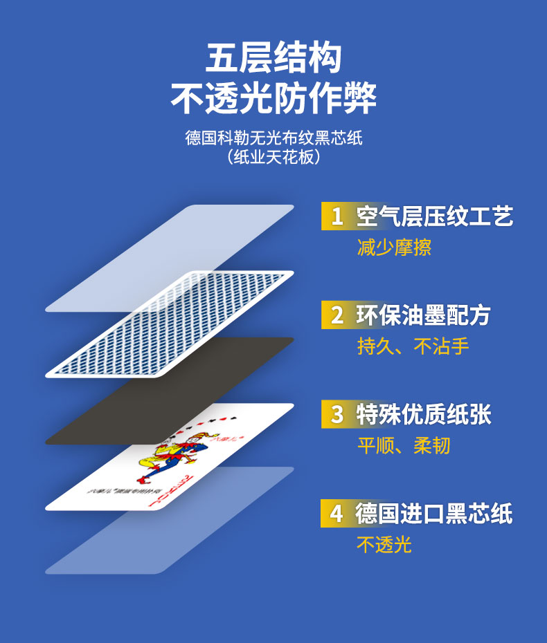 非工作時(shí)間適當(dāng)?shù)膴蕵?lè)放松,是為了工作時(shí)間可以更好地專(zhuān)注于工作!歡迎體驗(yàn)我們的“名牌”——六摩兒?摜蛋比賽專(zhuān)用高端撲克!完全不一樣的手感,不一樣的紙質(zhì)!55*100mm創(chuàng)新尺寸,握牌更舒服。采用德國(guó)進(jìn)口天花板級(jí)黑芯紙,空氣層壓紋工藝,環(huán)保油墨配方,平順柔韌不透光,清晰順滑耐用。