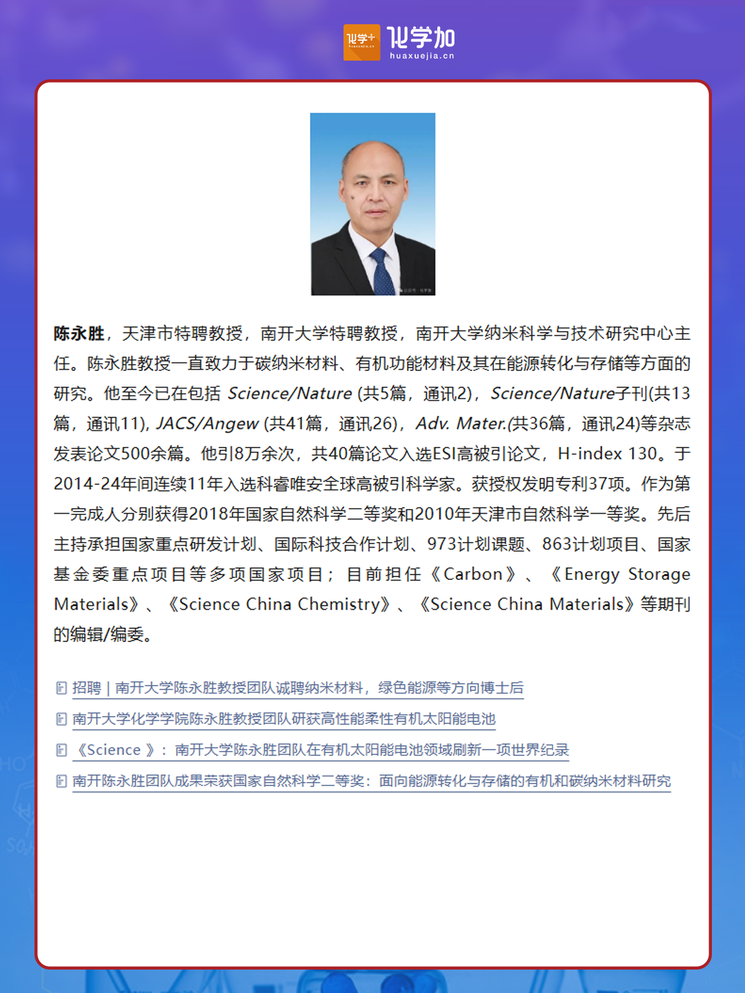 導(dǎo)讀:11月21日,中國科學(xué)院公布2025年院士增選當(dāng)選院士名單。2025年中國科學(xué)院選舉產(chǎn)生了73名中國科學(xué)院院士和27名中國科學(xué)院外籍院士,其中中國科學(xué)院化學(xué)部11人,分別是:陳永勝、郭林、胡文平、李雋、駱廣生、馬丁、申有青、唐波、夏海平、徐銅文、張萬斌,中國科學(xué)院外籍院士化學(xué)領(lǐng)域6人,分別是:克里斯蒂·安塞斯Kristi Anseth、亞力克西斯·貝爾 Alexis Bell、蓋伊·貝特朗 Guy Bertrand、崔屹 Yi Cui、本亞明·利斯特 Benjamin List、奧馬爾·亞吉 Omar Yaghi,祝賀各位專家學(xué)者
