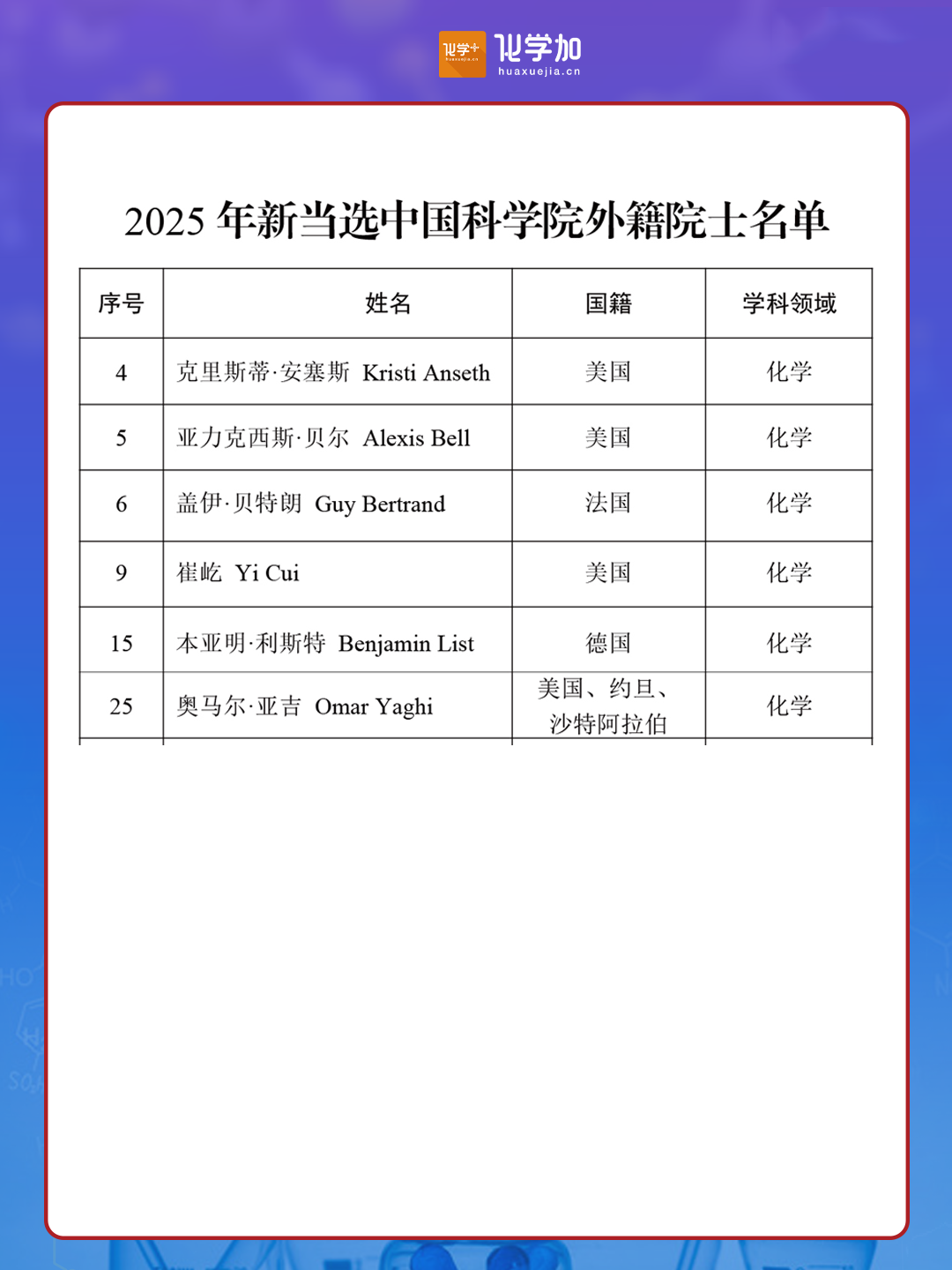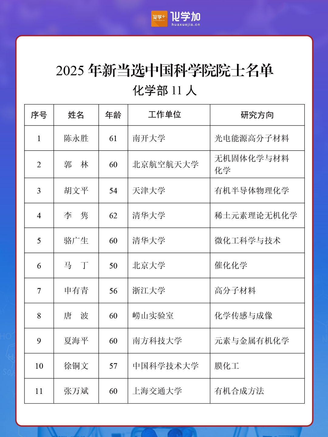 中國科學(xué)院2025年新晉院士,化學(xué)領(lǐng)域17人(附簡介)